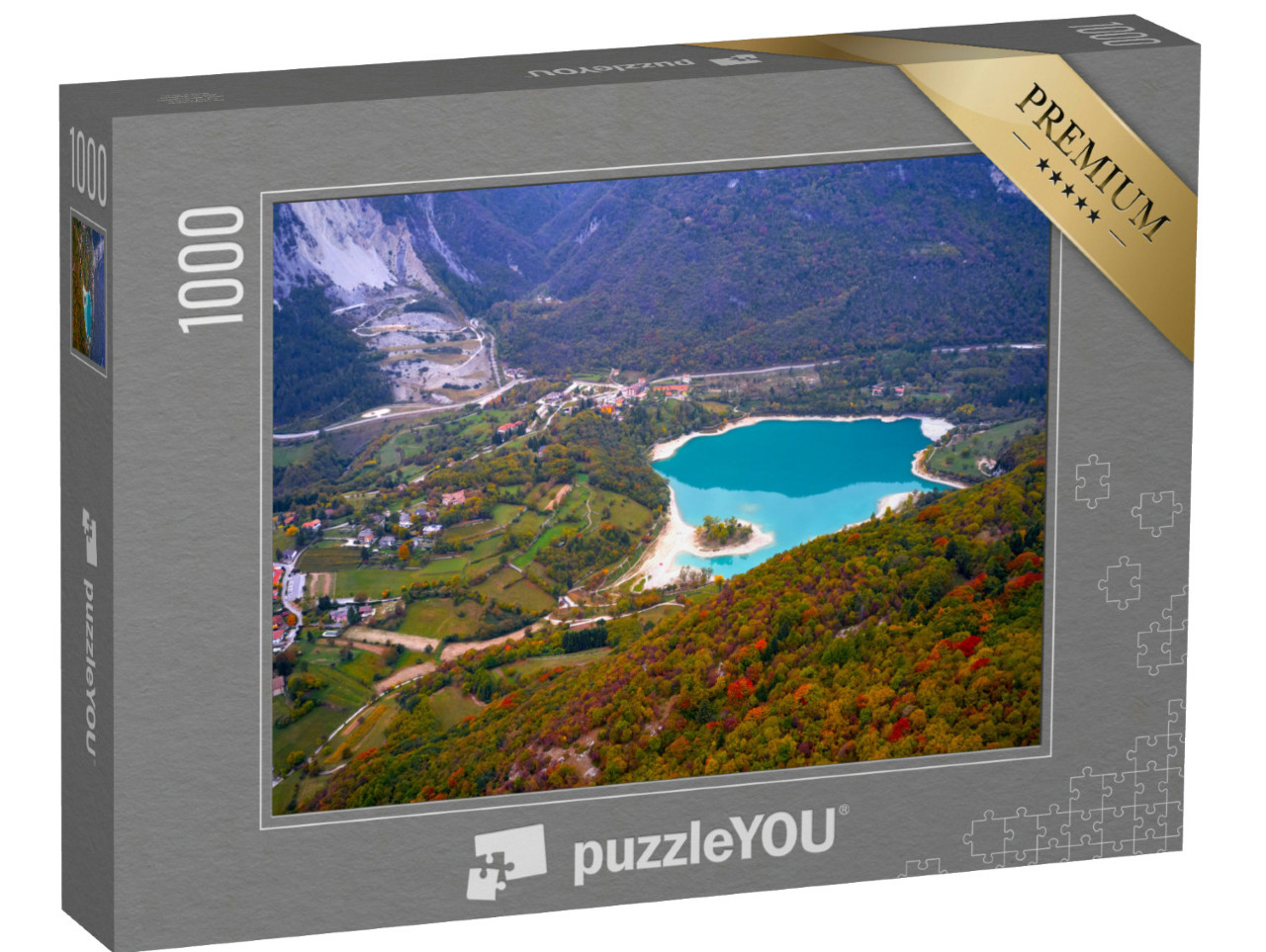Puzzle „Arial Vista del lago di Tenno in autunno, Trento, Italia. Lago turchese tra le montagne“