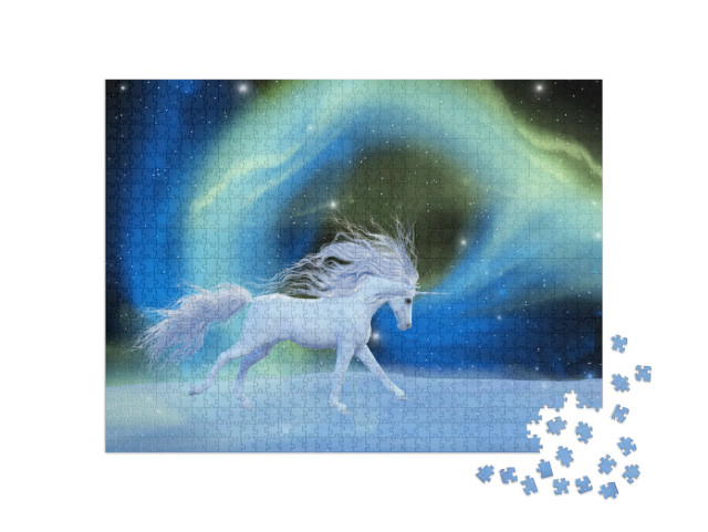 Puzzle „Arte digitale: Unicorno mistico in un universo di nebulose aurorali“