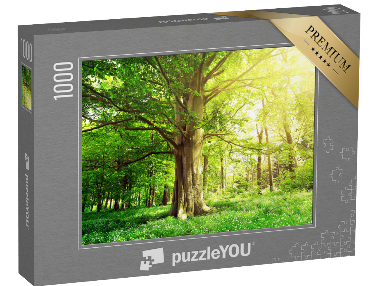 Puzzle „Foresta di faggi con un vecchio albero alla luce del sole“