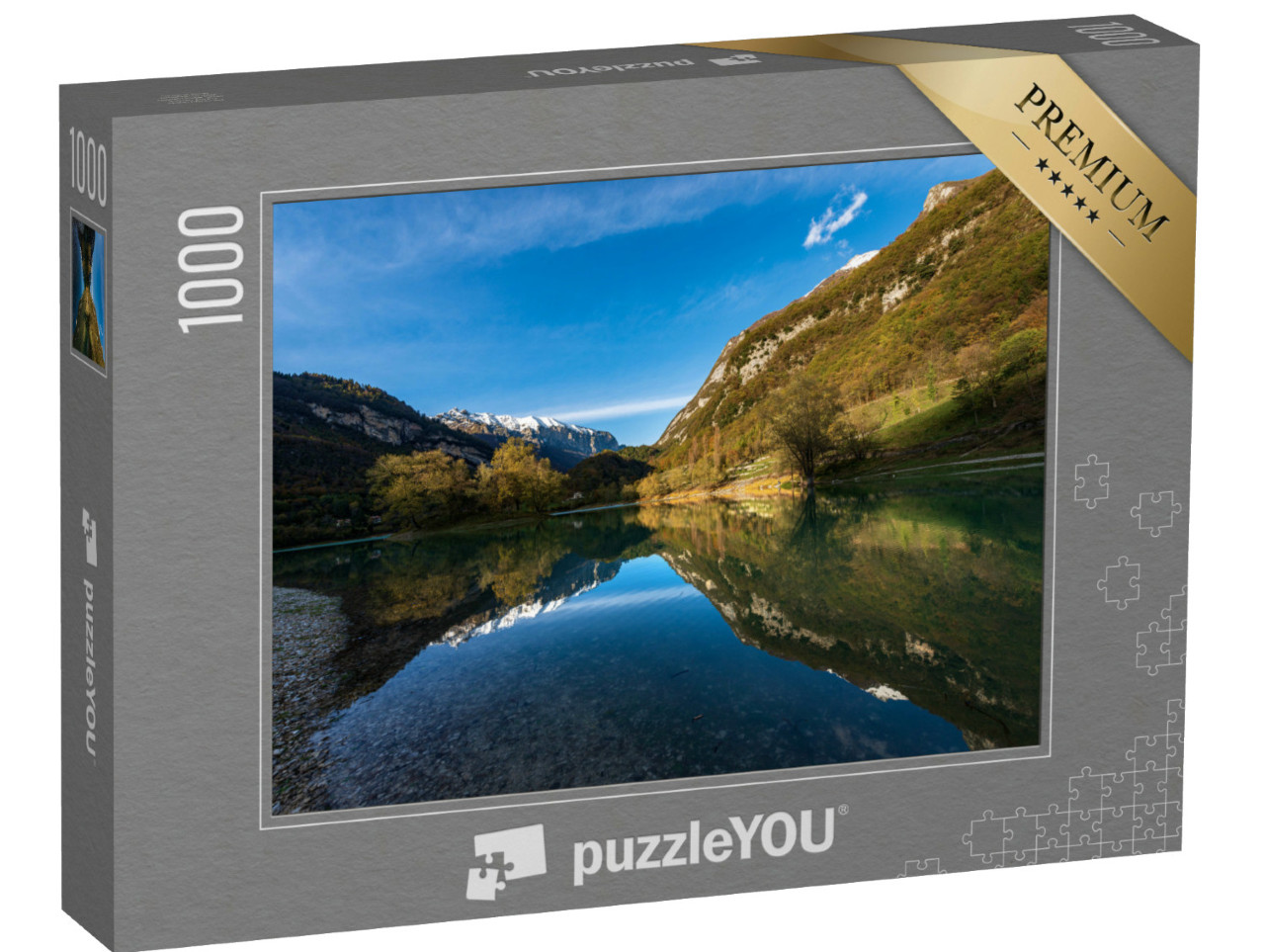 Puzzle „Lago di Tenno in autunno, piccolo e bellissimo lago con riflessi nelle Alpi italiane, Trentino-Alto Adige“