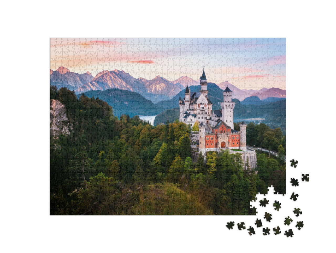 Puzzle „Panorama alpino con il castello di Neuschwanstein all'alba, Baviera“