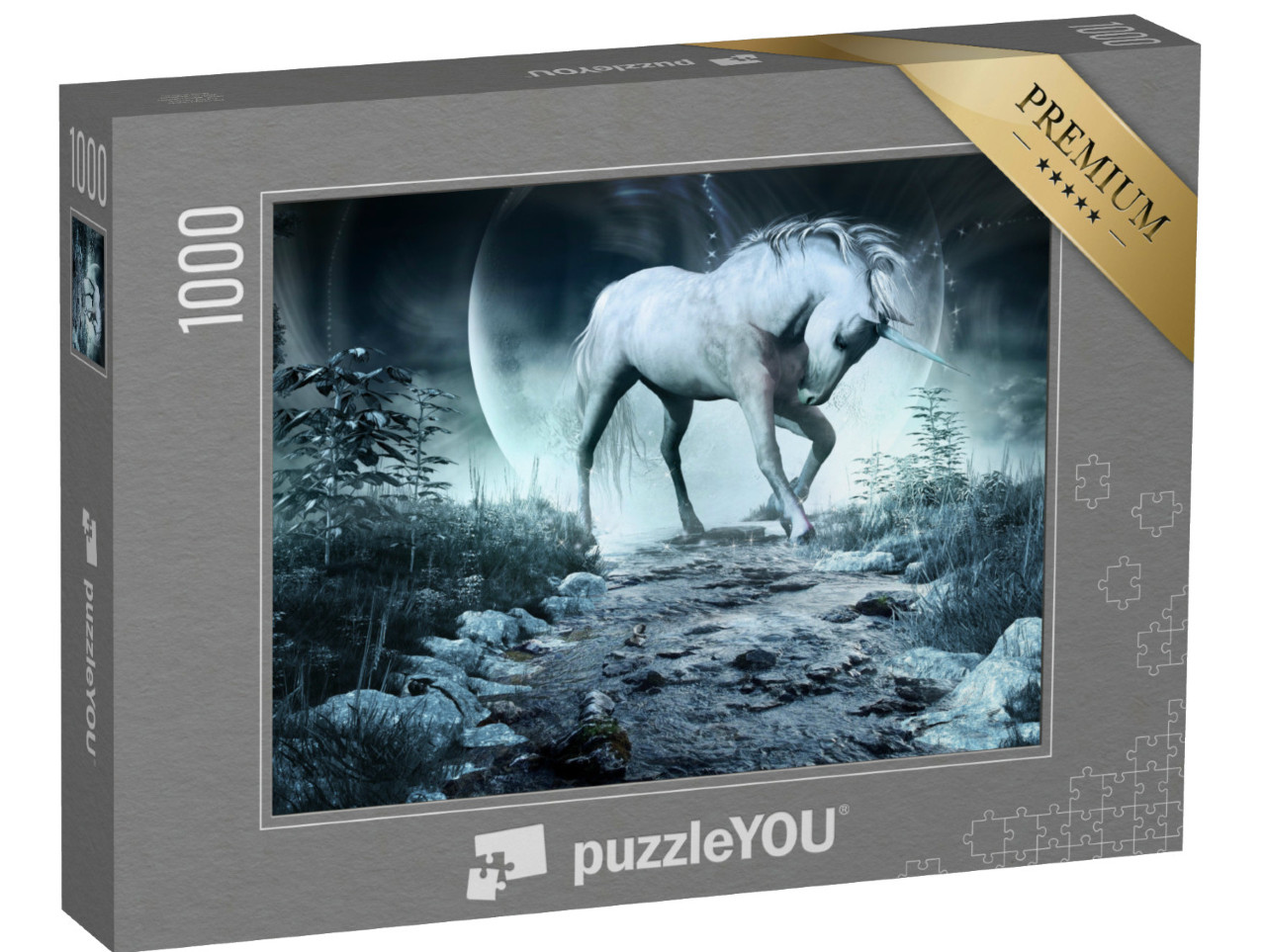 Puzzle „Scena notturna con unicorno, ruscello e luna“