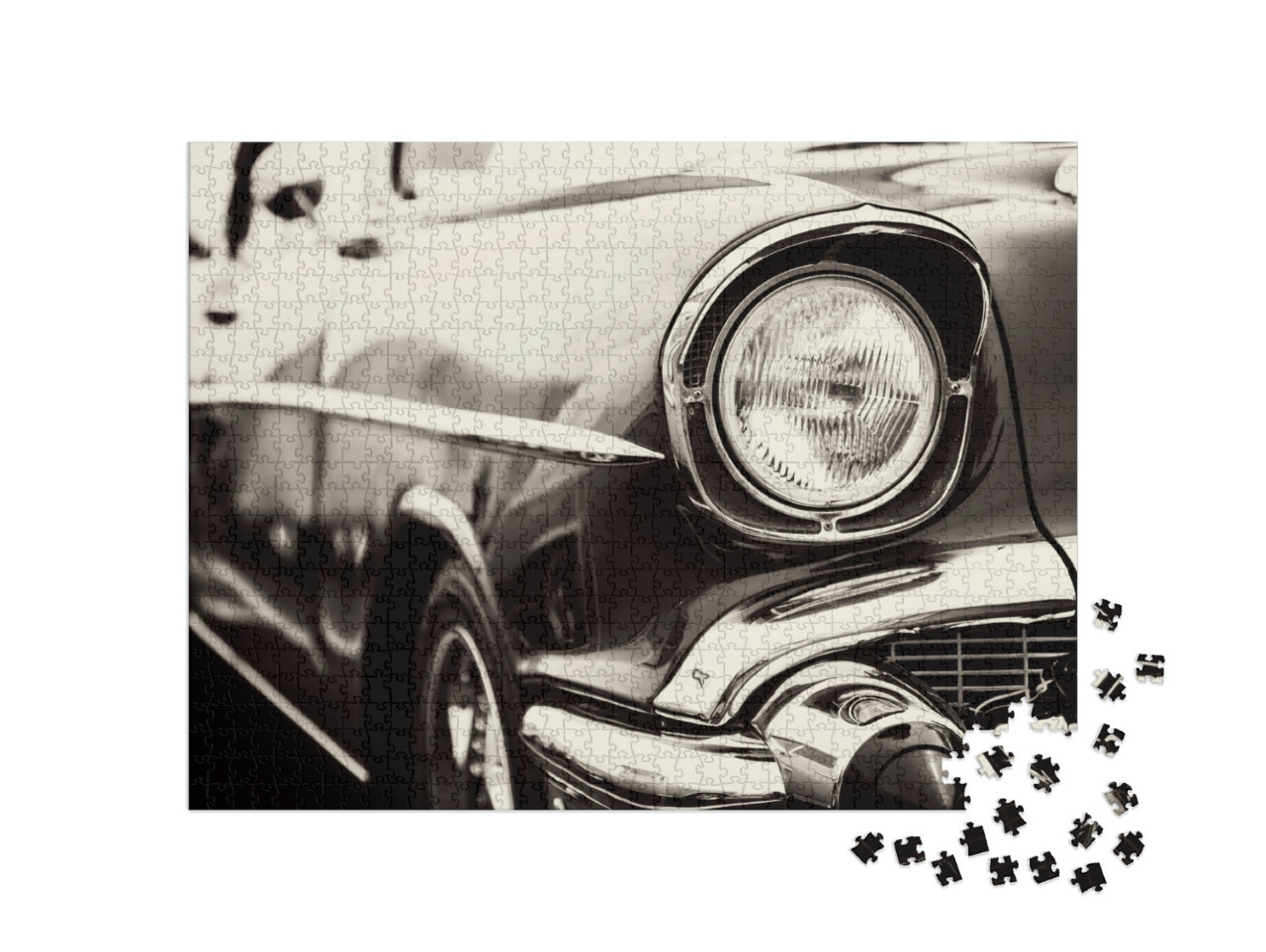 Puzzle „Un'auto d'epoca rossa con primo piano dei fari“