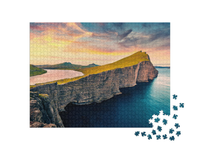 Puzzle „Vista aerea del lago Sorvagstan al mattino (Isole Faroe)“