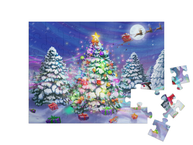 Puzzle „La slitta di Babbo Natale sopra un albero di Natale nella foresta innevata“